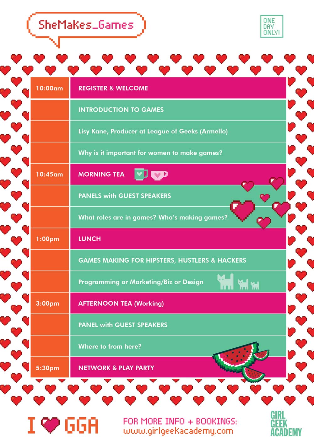 - Teaching 1 million women tech skills by 2025 with Girl Geek Academy. GGA has hosted Australia’s first all-female hackathon (#SheHacks), makerfest (#SheMakes) and game development program (#SheMakes_Games). In 2016 we will run #SheJams – Australia’s first all-female Game Jam!